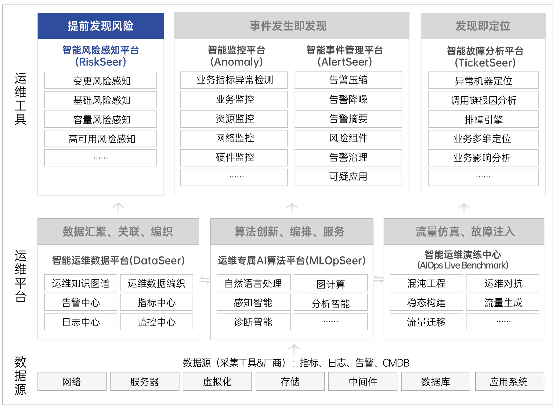 其中,必示变更风险感知平台以数据平台为数据集成能力底座,整合多源、异构运维数据,以运维算法专属平台为智能化能力底座,结合专家业务知识、融合AI算子编排和调用能力,通过平台灵活的编排配置,可以针对各类场景需求,形成标准化的风险检查项,构建面向系统变更的风险识别能力,并借助风险管理流程事项风险闭环管理,达到将知识、AI、自动化、管理规范等融入运维工作流程的目标,并以可量化的衡量标准提升系统变更后运行健康指数。