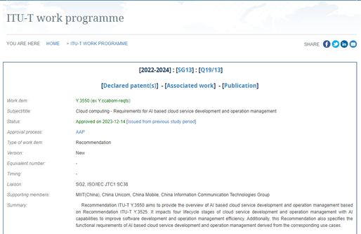 ITU-T Y.3550 Cloud computing - Requirements for AI based cloud service development and operation management。该项国际标准由中国信息通信研究院牵头制定,旨在通过进一步明确智能运维的功能要求,推进各方对智能运维能力体系架构达成共识,加强国际交流合作,以促进智能运维领域技术、应用的有效落地,持续推动国内外AIOps相关产业的健康有序发展。