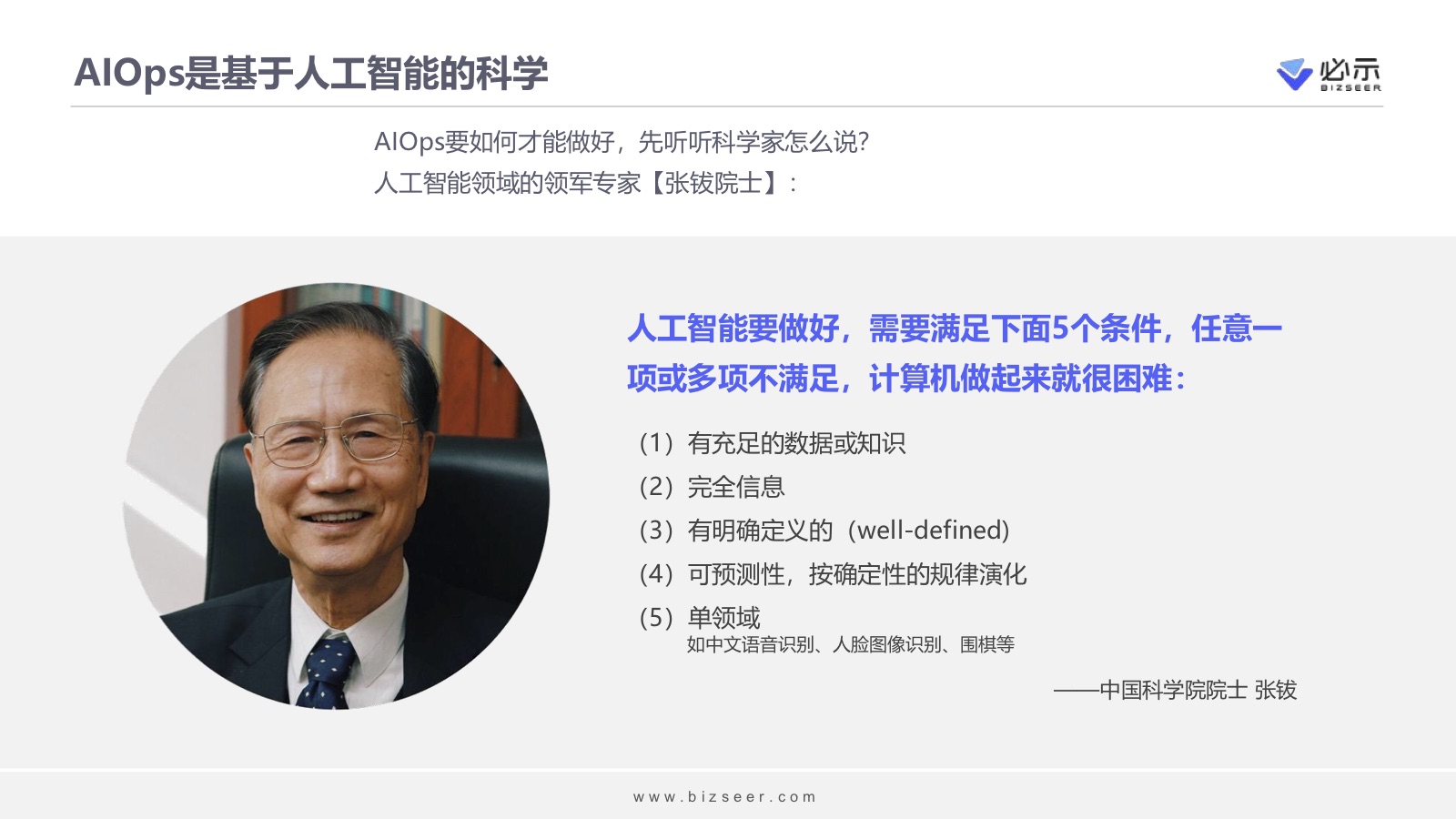 AIOps是AI+Ops。AI是一门科学,AIOps是基于人工智能的科学。中国人工智能领域顶级专家张钹院士提到,人工智能要做好,需要满足5个条件(如下图所示),任意一项或多项不满足,做起来就很困难。