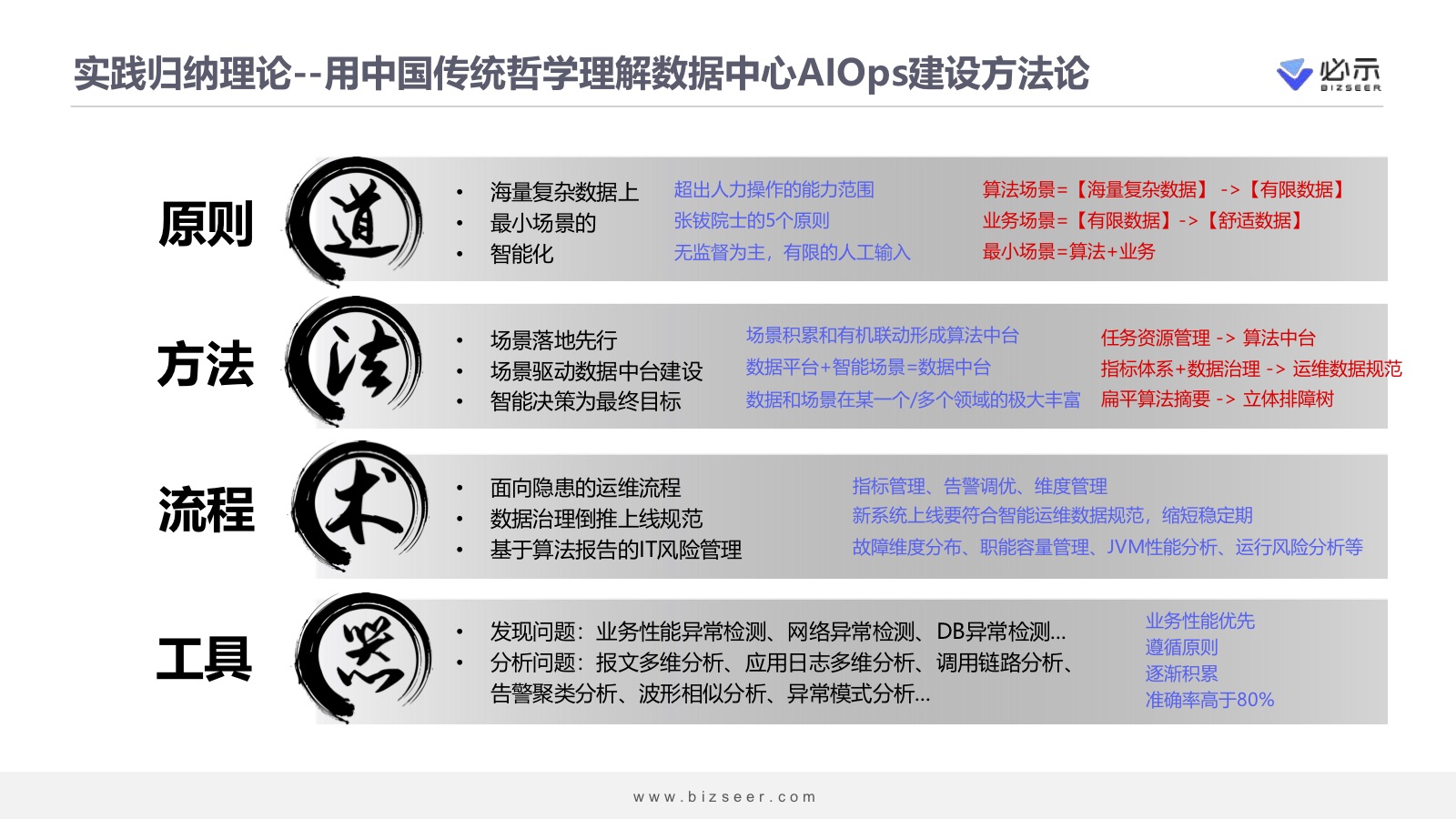 这里,我借用中国传统哲学的概念“道法术器”,来说明数据中心AIOps建设。当然这个方法论只是初步的想法,尚不成熟。