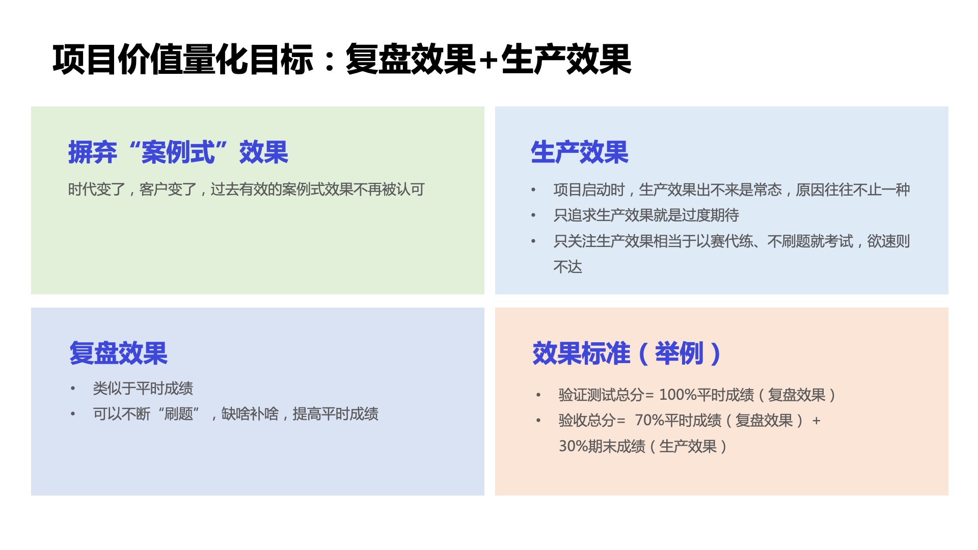 智能运维系统建设可量化目标确定了,以出效果为导向的方法路径有了,那么最终如何衡量和评价当前智能运维效果?在具体项目验收时,既要摒弃“案例式”效果,同时也不要过度期待“生产效果”。在协作式迭代中对于结果的验收过程,“复盘效果+生产效果”才能客观反映智能运维系统的效果和价值。