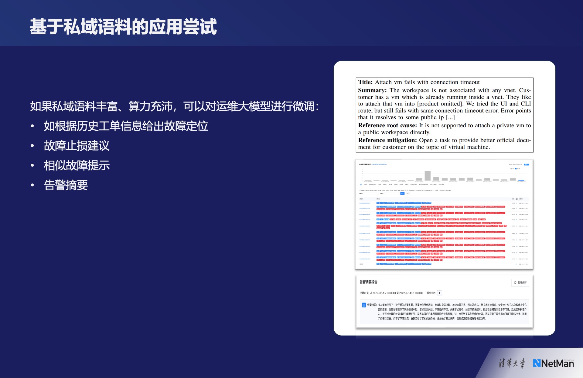 某些规模庞大的机构,如果拥有充足的语料和算力资源,实际上可以进行类似私域微调的工作。微软曾发表过相应的论文,基于其公有云上大量的工单数据,利用机器自动生成工单。经过评估,机器生成的工单与人工书写的工单非常接近。说明机器具备这样的能力,但这涉及到语料的质量和数量方面的要求。