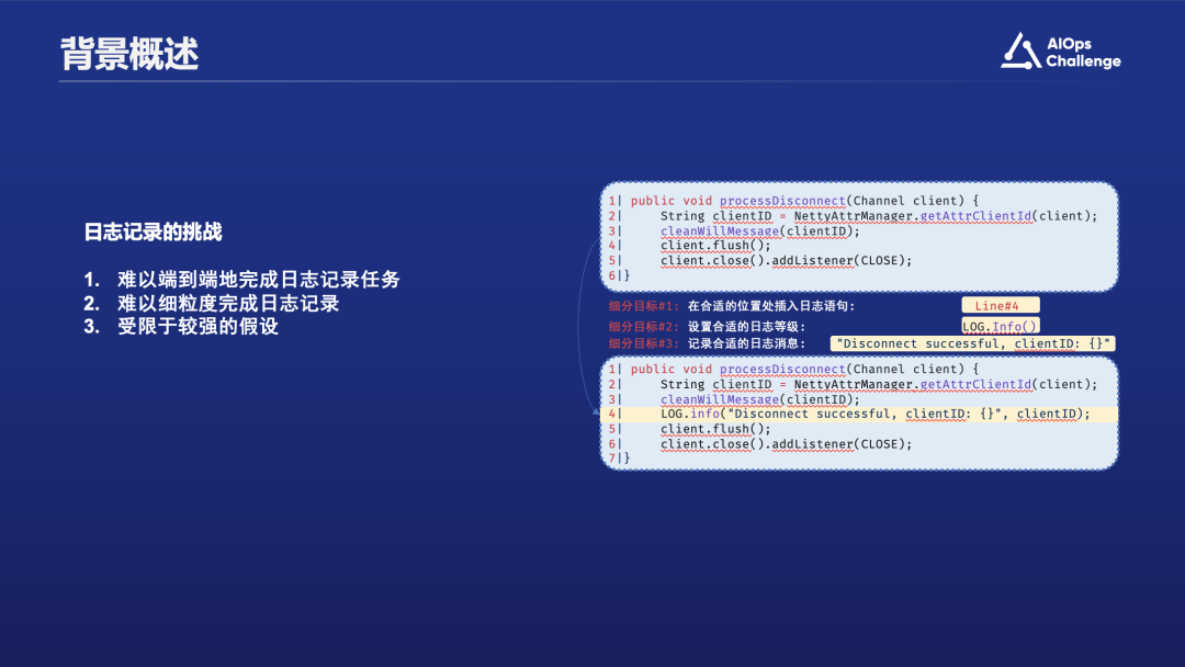 尽管这么多年来的研究取得了一些进展,但过去的研究仍存在一定的局限性。大多数研究工作会将问题拆解为几个子任务来解决,每篇论文通常只关注一个子任务。如前述图例,研究者通常把日志语句生成任务划分为三个部分:首先是确定在哪一行添加日志,比如上图例子中是在第四行添加日志;其次是定义日志的级别,例如上图代码中“log”后面的级别是“info”;最后是决定记录哪些详细信息,如上图所示的“disconnect”事件。然而,这些解决单一子任务的方法通常无法实用。当我们尝试将研究应用到产业界时,通常需要将这些不同的日志生成子任务结合起来构成一个完整的任务,并通过一个综合的日志生成解决方案来解决现实日志生成问题。