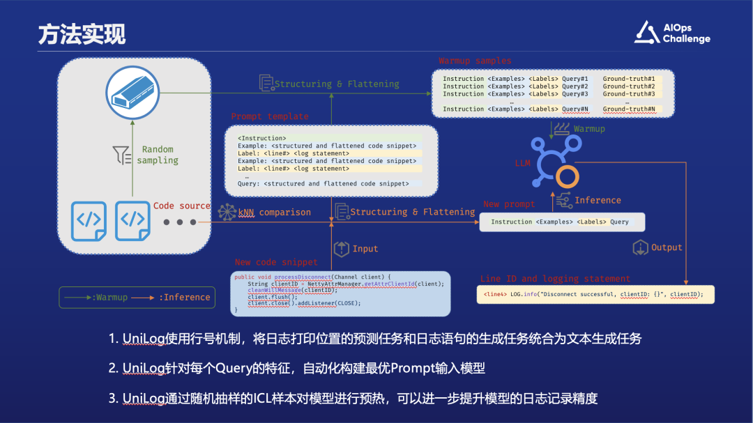 在处理完所有参考样例和他们的标签之后,UniLog将会把它们拼接在同样预处理好的目标代码段前,组装成一个完整的提示词。之后,UniLog将会提交提示词给大语言模型进行生成。生成的结果同样是如图片右上角所示的包含行号的日志语句。除了前面介绍的提示词相关的知识以外,我们还会用大模型做预热。