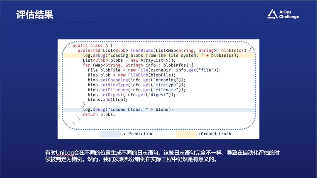 以图中所示例子,黄色背景标注的代码行表示Ground-truth中的日志内容——"Loading blobs from the file system"。而下方蓝色背景的行展示了大语言模型生成的日志语句。尽管该语句与Ground-truth有所出入,并在评估中被认作是错误案例,它实际上也包含了有益信息。具体而言,模型产生的语句记录的是blob对象实例化后的数据,而非Ground-truth中记录的实例化前的元数据。这两种日志语句均能够提供关键的blob对象信息。因此,在自动评估中不符合预设标准的用例可能仍然有潜力向开发者提供可用的信息。