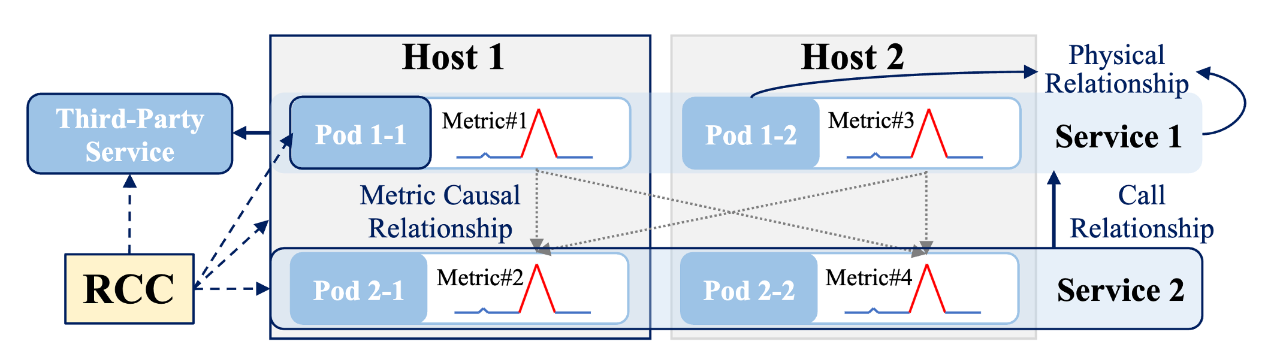 上图展示了一个由Service 1引起的微服务系统故障及其对应的候选根因集RCCs。这些RCCs可以是异构的和多层次的。此外,由于Service 1与Pod 1-1和Pod 1-2均有包含关系,Service 1的故障也造成了对应Pod的异常波动。如果没有指标能够独立反映Service 1的状态情况,那么现有的RCA算法通常难以区分出具体的根因是来自于Pod 1-1、Pod 1-2或Service 1。
