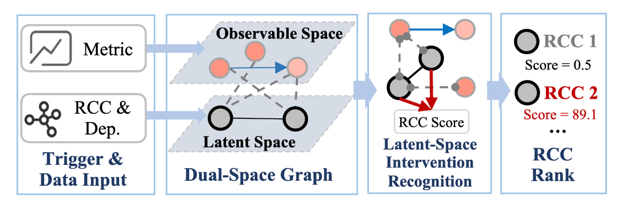 微服务系统的根因分析(RCA)对于确保系统的稳定性和可靠性至关重要,论文提出了一种新的无监督RCA框架LatentScope,能够在受限的可观测性条件下推断异构的候选根因。LatentScope通过构建双空间图模型,将可观测变量和隐空间变量分离开来,从而缓解了候选根因的异构性与受限可观测性带来的根因定位不准确的问题。创新地提出了隐空间下的因果推断技术,实现了对于候选根因隐变量的精确推断。通过真实故障案例的实验,验证了LatentScope在应对异质候选根因与有限观测性下良好的根因定位能力。