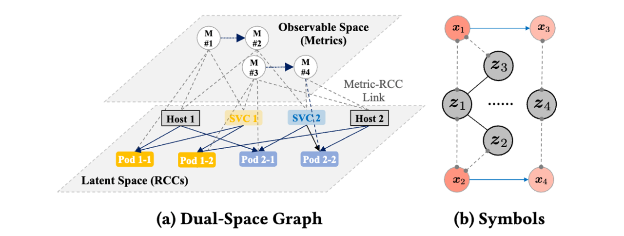 为了解决这一问题,论文首次提出将候选根因建模为隐变量,通过相关的监控指标来推断候选根因的状态,而不是直接根据某个可观测指标判断候选根因的状态。基于此思想,论文提出了LatentScope,一种在受限可观测性下处理异构候选根因的无监督RCA框架。LatentScope通过双空间图(Dual-Space Graph)模型(包括可观测变量和不可观测变量)来实现快速的隐变量推断和RCA。基于eBay的实际故障数据与Testbed数据的评估结果表明,与基线算法相比,我们模型的根因定位效果取得了显著的提升。