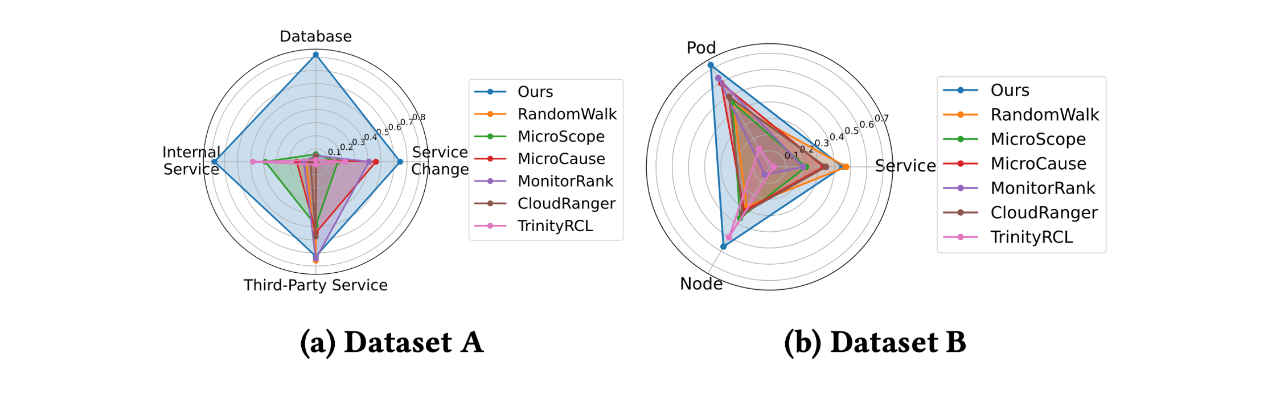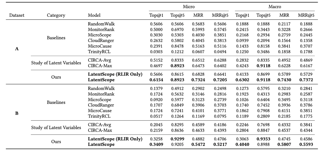 论文分别基于了来自eBay真实故障案例的数据集(Dataset A)与来自Testbed故障注入的数据集(Dataset B)进行了评估,对比LatentScope与基线模型的根因定位准确率。其实验结果如表1所示。结果表明,LatentScope在所有的评估指标中,均能够超过现有的基线模型。