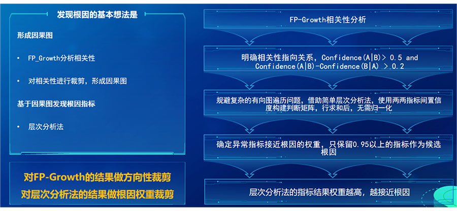 - 形成因果图:这里首先采用FP-Growth算法分析出异常指标之间的相关性,然而相关性不一定能代表因果性,所以这里还对FP-Growth的结果做了一定的裁剪工作,异常指标之间的置信度必须大于0.5,且正向和反向的置信度差值必须大于0.2,相关关系中取置信度大的方向作为因果方向,这样就形成了因果有向图。