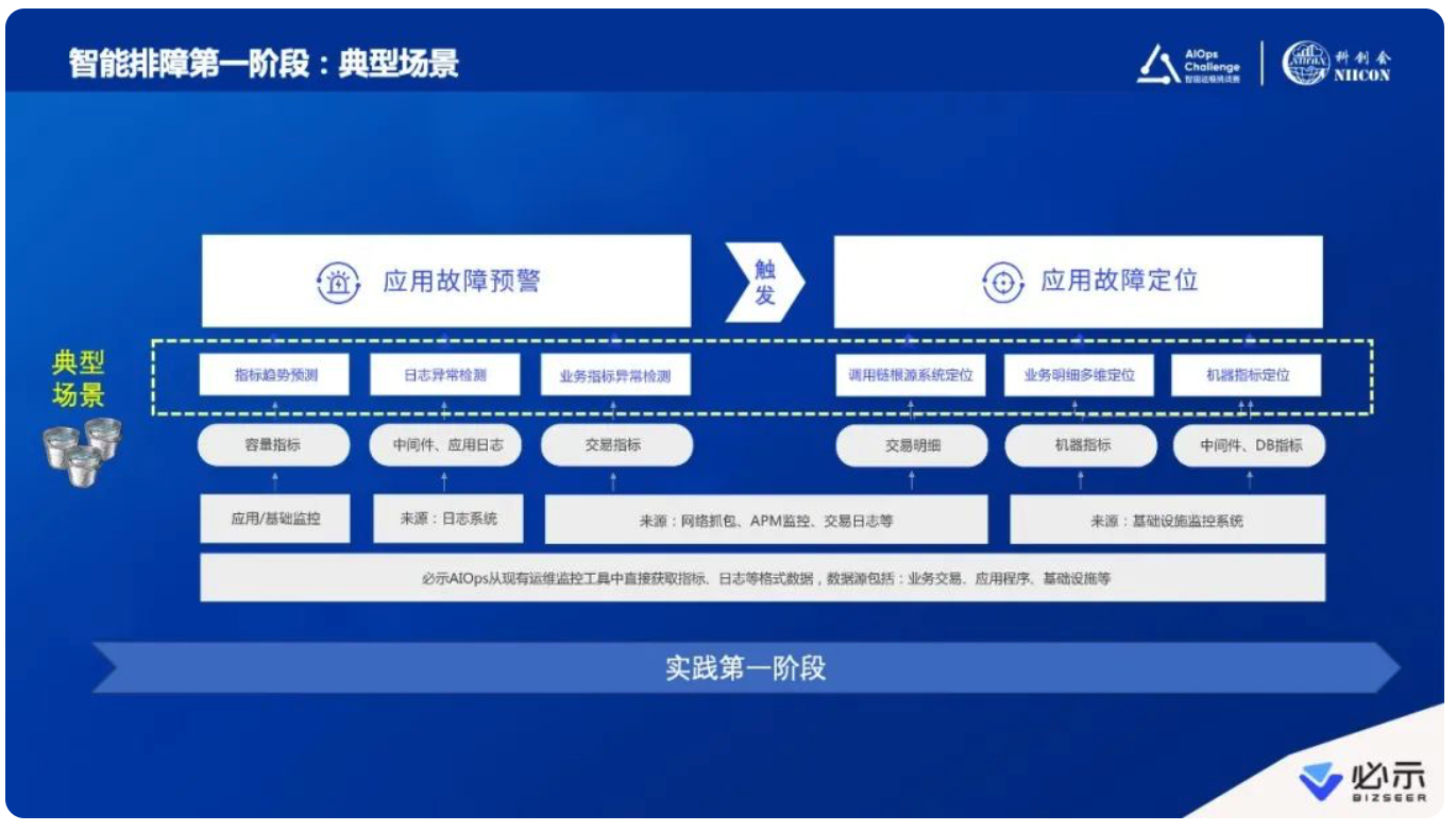 必示科技团队在智能运维实践过程中,经历了几个阶段。第一阶段,我们联合合作企业的专家们一起定义了一些常见场景,定义了一些“桶”,比如利用业务指标数据做异常检测、利用交易数据做定位、利用机器数据做定位、利用中间件层面指标做定位等。我们在这样明确的场景中去做好算法达到预期效果。但依然是先有人根据经验框定了具体范围,正是因为框定了这些范围,才有可能做好算法设计,因为算法解决的是明确、具体的问题。