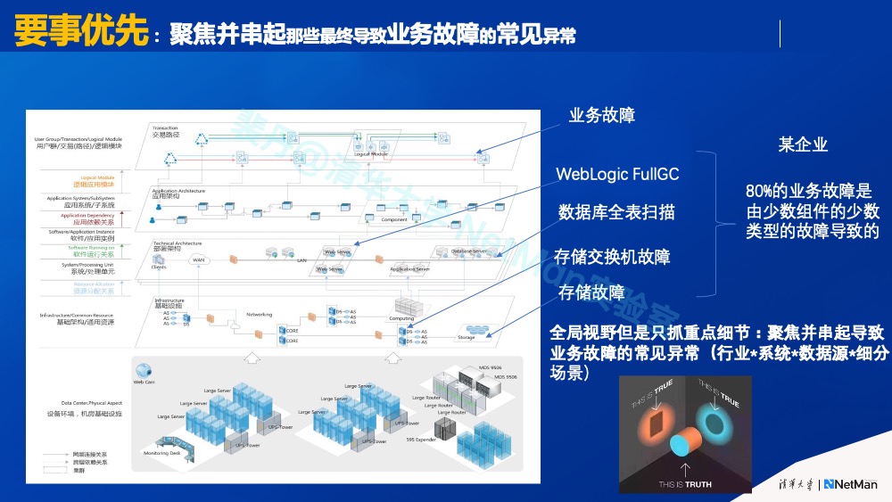 在上述体系中,决定先做的原则是要事优先,即聚焦并串连最终导致业务故障的常见异常。这里引用一个数字,某企业80%的业务故障是由少数组件的少数类型的故障导致的。这其实遵循了“二八定律“,20%的组件故障类型导致了80%的业务故障。因此,我们应首先聚焦解决这些常见故障,要有全局视野,先抓重点细节,聚焦并串起导致那些业务故障的常见组件故障,这就是规划AIOps时从价值角度出发的“要事优先”原则。
