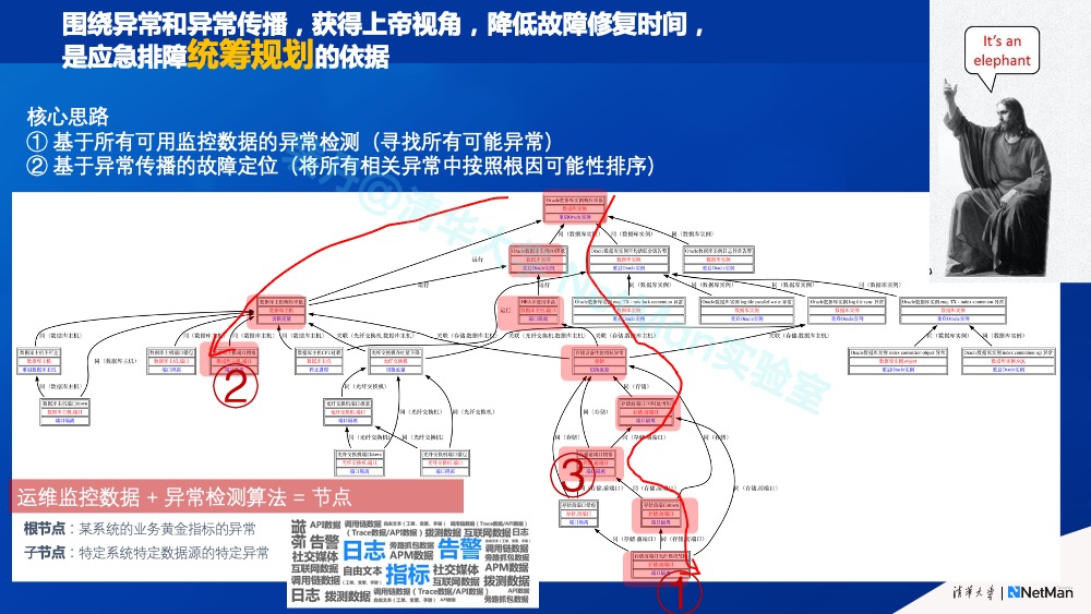 数据和知识双轮驱动的要点在应急排障中的具体体现:一是基于全量数据做异常发现;二是基于知识对一个个零散的异常信号进行关联,从而获得“上帝视角”(如下图)。