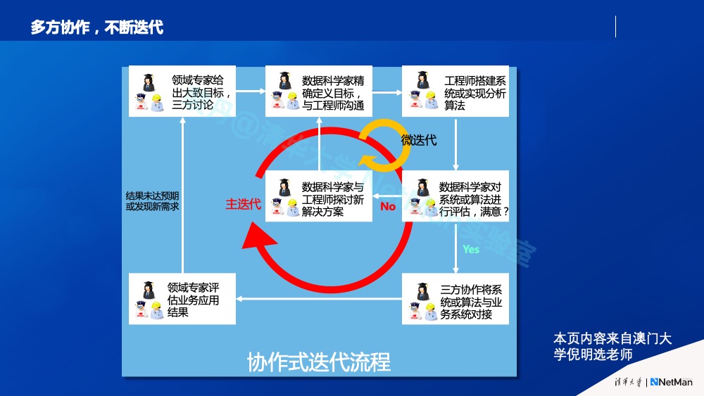 澳门大学校长倪明选教授也曾总结过“数据分析的协作式迭代流程”(如下图):数据分析,需要领域专家、工程师、算法专家讨论目标,进行大循环的迭代,然后算法和工程师进行微迭代,大小循环都要往复很多圈,才能实际落地解决一个现实中的复杂数据分析问题。