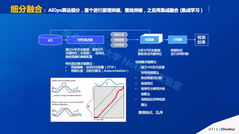 以单指标异常检测为例,我们自动对它进行画像,然后通过领域知识知道每一种画像适合哪种算法。最终通过这种方式,知识、画像、知识映射到具体的算法和算法的组合,达到了融合的效果。(据我所知,很多计算机视觉的应用也是采用了多个算法的集成融合。) 因此,我们研制算法的时候要细分,逐个进行原理突破,落地突破之后再集成融合,这也是AIOps落地实践中一个非常好的经验。