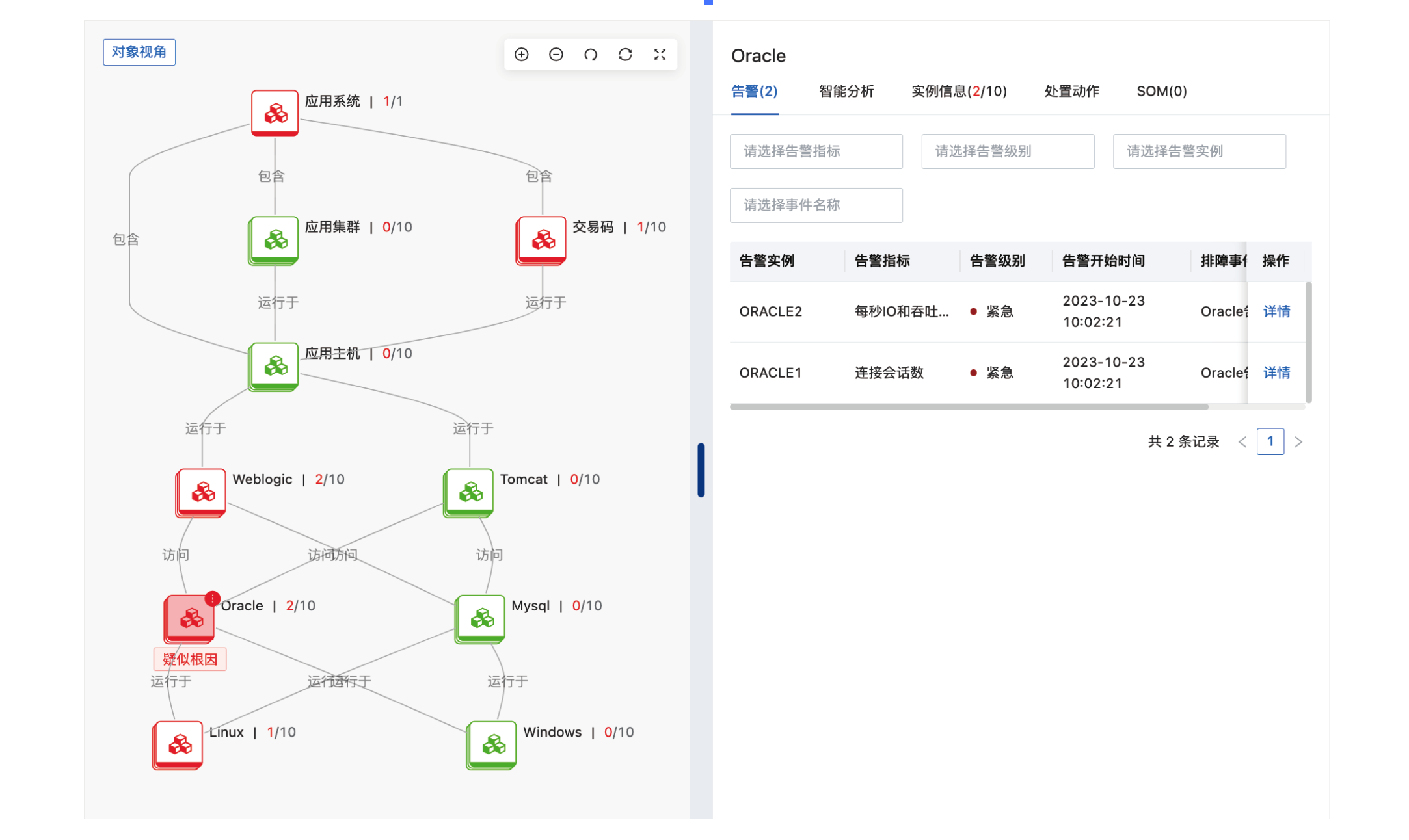 在故障发生时,通过拓扑关联展示告警、指标等数据信息,提供全局的故障视角,并且提供重要告警推荐功能,辅助运维人员快速排障和处置。